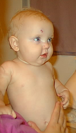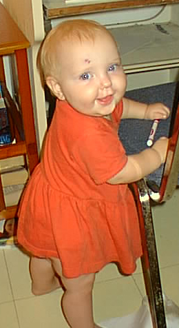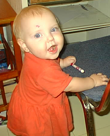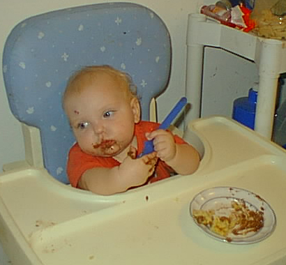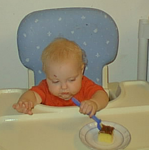 Cassandra Joy turned one on November 12th, 2003. We didn't have a birthday party for her....but we did give her the traditional slice of chocolate cake (well, yellow cake with chocolate frosting). The results are as follows.....